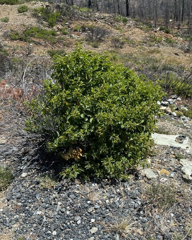 Coffeeberry is a fast-growing, evergreen to semi-evergreen large shrub with a naturally rounded form that thrives in full sun to part shade. It sports glossy, dark green leaves and produces small, inconspicuous greenish flowers in late spring and early summer that attract and support pollinators. By late summer, the flowers give way to attractive clusters of fruit that resemble coffee beans. This ecologically important shrub supports a wide range of pollinators, provides fruit and cover for birds and other wildlife and works beautifully as a hedge, screen, or backbone plant in habitat gardens and drought-tolerant landscapes. Allegedly, it can live 100-200yrs old!Â