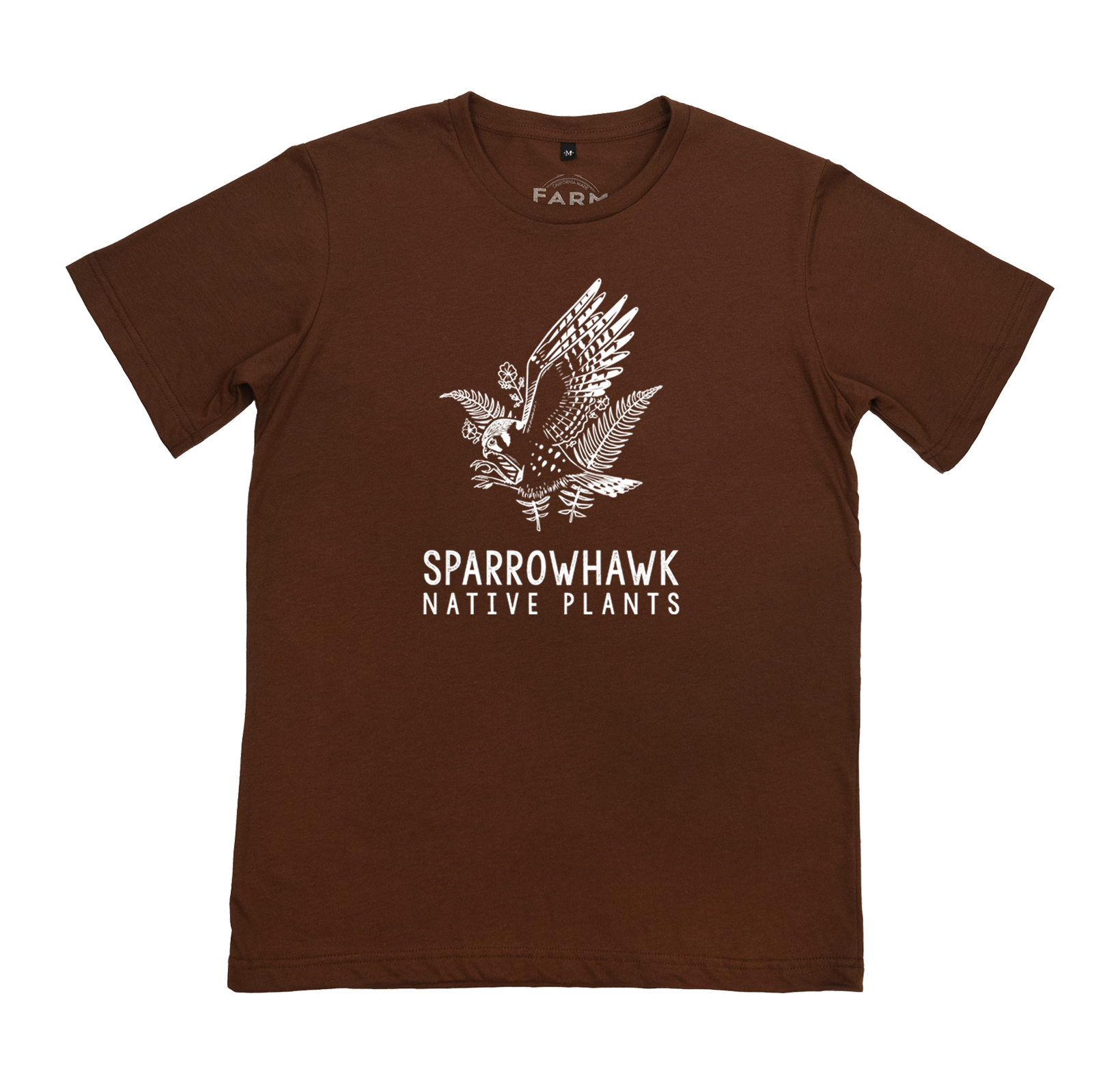 Sparrowhawk Eco Tee in Redwood. Made by Farm Fresh Clothing Co, these unisex sized tees are Made in the USA, 100% Cotton, and printed with eco-friendly water-based inks.